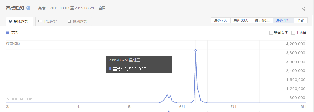 較為顯著的就是“高考貼吧”,6月份百度指數日均破350W。面度如此高漲的數據,然而高考貼吧也是這部分流量最佳去處。