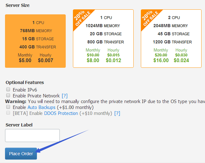 這里我們選擇VPS配置,內(nèi)存、流量、硬盤(pán)是不同的,價(jià)格也不同,我們根據(jù)自己需要選擇。然后點(diǎn)擊PLACE ORDER開(kāi)通。
