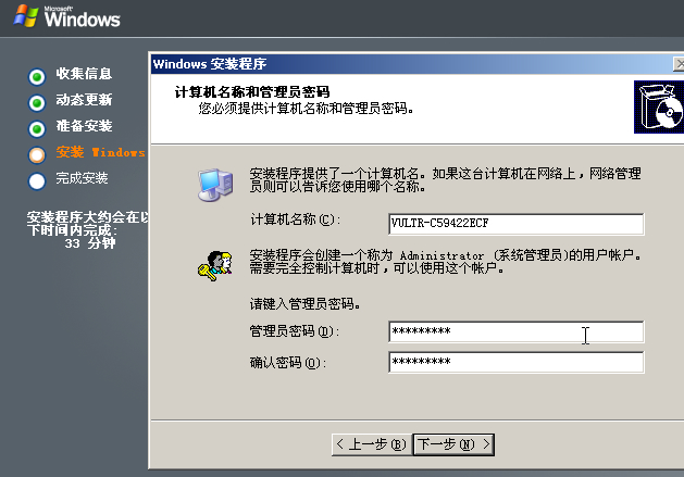 選擇格式化分區(qū),然后等待完畢。會(huì)自動(dòng)復(fù)制程序文件安裝。VULTR安裝WINDOWS系統(tǒng)還是比較快的,畢竟是SSD固態(tài)硬盤(pán)。