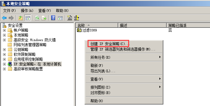 1、首先打開ip安全策略:控制面板–管理工具–本地安全策略–IP安全策略,在本地計算機上。在右側空白處右擊,選擇創建IP安全策略