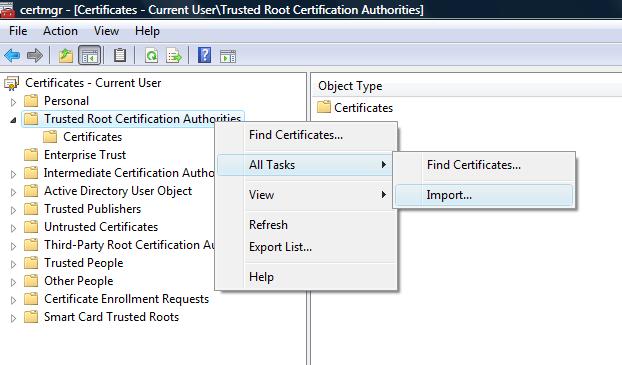在 開始-運行 里輸入certmgr.msc,打開Certificate Manager,找到Trusted Root Certification Authorities目錄,