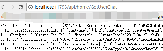 {"ResultCode":1000,"Message":"成功","DetailError":null,"Data":[{"Id":"595225a5bbccc61ff88e89a7","ChatName":"testttt","ChatType":2,"CreaterUserId":76,"Members":[],"CreateTime":"2017-06-27 17:30:13","LastChatTime":"2017-11-10 17:43:17","LastChatText":"[定位]","IsDisbanded":false},{"Id":"5952445ebbccc71ff8adf671","ChatName":"測試2","ChatType":2,"CreaterUserId":13,"Members":[],"CreateTime":"2017-06-27 19:41:18","LastChatTime":"2017-06-27 19:48:47","LastChatText":"行","IsDisbanded":true},{"Id":"5952463dbbccc71ff8adf67d","ChatName":"巡視頻么么噠噠","ChatType":2,"CreaterUserId":13,"Members":[],"CreateTime":"2017-06-27 19:49:17","LastChatTime":"2017-12-20 19:47:17","LastChatText":"[定位]","IsDisbanded":false},{"Id":"59524c0ebbccc71ff8adf6ae","ChatName":"rrrffff","ChatType":2,"CreaterUserId":13,"Members":[],"CreateTime":"2017-06-27 20:14:06","LastChatTime":"2017-06-27 20:34:54","LastChatText":"6565","IsDisbanded":false},{"Id":"59531cdfbbccc414e8f6769f","ChatName":"都紛紛fee俄方熱熱","ChatType":2,"CreaterUserId":76,"Members":[],"CreateTime":"2017-06-28 11:05:03","LastChatTime":"2017-06-28 11:05:13","LastChatText":"123","IsDisbanded":true},{"Id":"59531de5bbccc414e8f676a1","ChatName":"天賦過人托管人","ChatType":2,"CreaterUserId":76,"Members":[],"CreateTime":"2017-06-28 11:09:25","LastChatTime":"2017-06-28 11:09:33","LastChatText":"呃呃呃","IsDisbanded":true},{"Id":"59531e40bbccc414e8f676a3","ChatName":"熱熱","ChatType":2,"CreaterUserId":76,"Members":[],"CreateTime":"2017-06-28 11:10:56","LastChatTime":"2017-06-28 17:58:41","LastChatText":"333","IsDisbanded":false},{"Id":"59532140bbccc414e8f676a6","ChatName":"會厭結核有機會好好","ChatType":2,"CreaterUserId":76,"Members":[],"CreateTime":"2017-06-28 11:23:44","LastChatTime":"2017-06-28 11:24:40","LastChatText":"eee","IsDisbanded":true},{"Id":"595321d3bbccc414e8f676a8","ChatName":"656565656","ChatType":2,"CreaterUserId":76,"Members":[],"CreateTime":"2017-06-28 11:26:11","LastChatTime":"2017-06-28 18:50:08","LastChatText":"ggg","IsDisbanded":false},{"Id":"5954d0eebbccc40fecbea435","ChatName":"r","ChatType":2,"CreaterUserId":76,"Members":[],"CreateTime":"2017-06-29 18:05:34","LastChatTime":null,"LastChatText":null,"IsDisbanded":false}]}