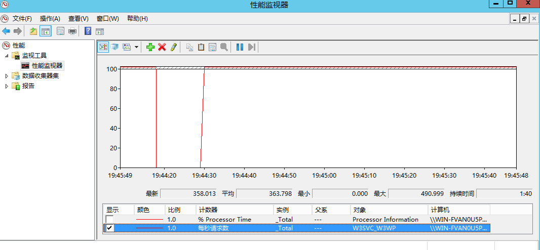 啟動性能監視器,統計每秒請求數,也與壓力測試的結果吻合。每秒358次。