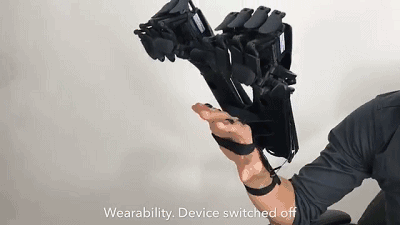使用時需要將它套在手臂末端,通過食指和無名指上的運動傳感器進行控制。