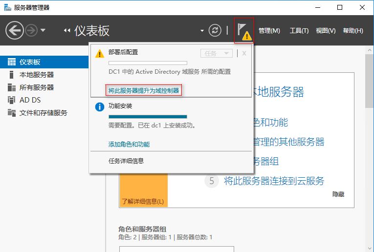 1)打開(kāi)服務(wù)器管理器,點(diǎn)右上角點(diǎn)小旗子,點(diǎn) 將此服務(wù)器提升為域控制器;