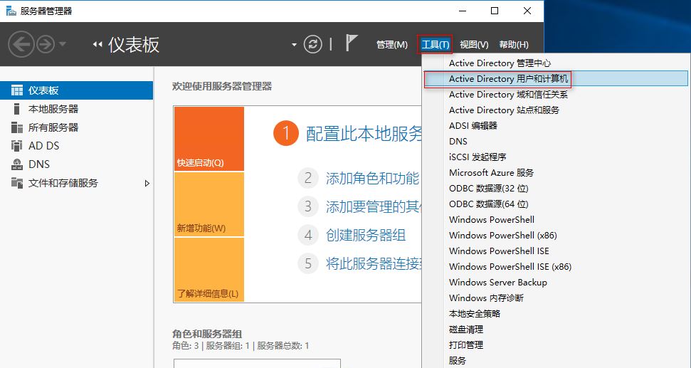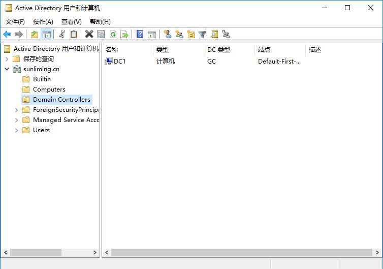 9)重啟后進(jìn)入系統(tǒng)。此時(shí)AD部署成功,點(diǎn) 工具- Active Directory用戶和計(jì)算機(jī),查看部署的的域