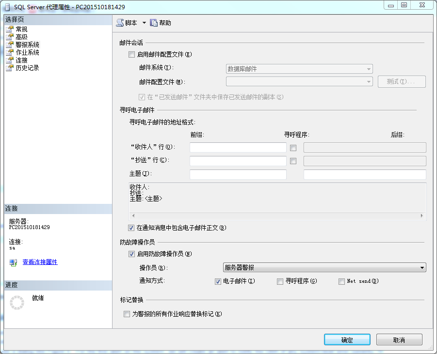 你在SQL Server代理屬性對話框里定義防故障安全員(右擊SQL Server代理,選擇屬性),在警報系統頁。勾選啟用防故障操作員,然后從列表里選擇系統已經定義的操作員,如插圖3所示。當完成選擇后,點擊【確定】。注意這頁的其它選項會在下一篇的數據庫郵件里談到。