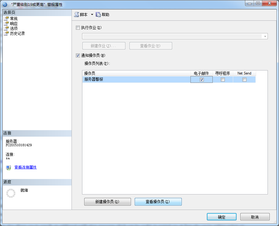 一旦警報觸發,在警報里定義的響應會發生。這些響應要么執行特定的SQL Server代理作業,要么通知一個或多個操作員。你也有可以指定觸發錯誤信息的選項,包括在任何發送的提醒里。