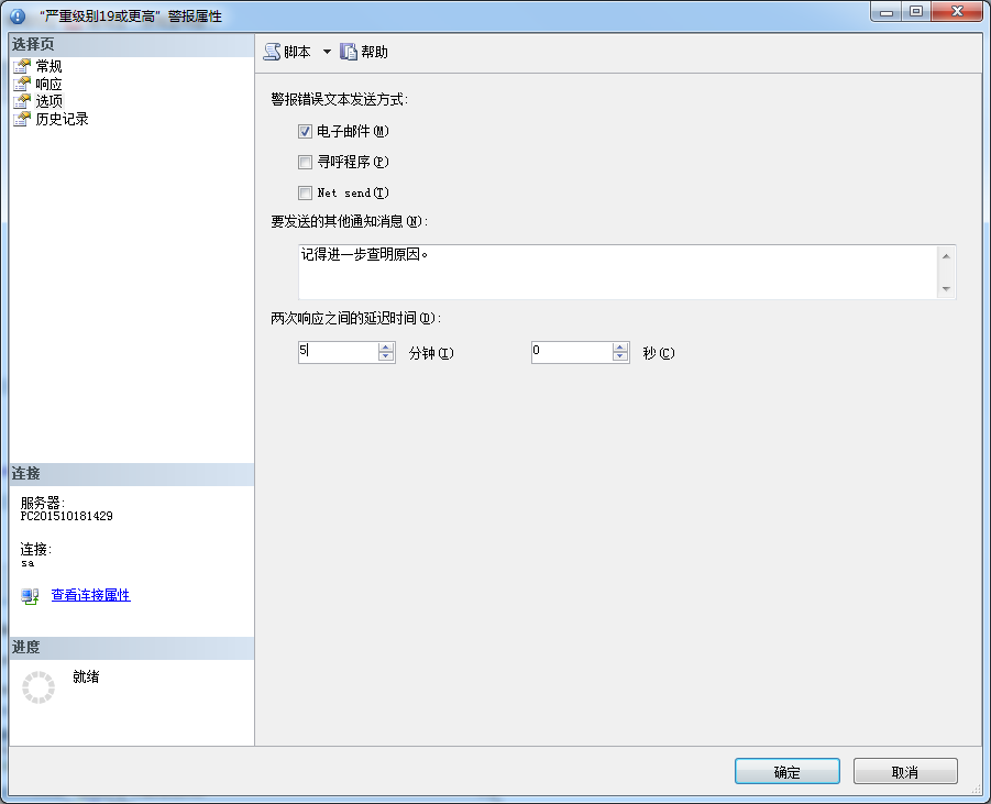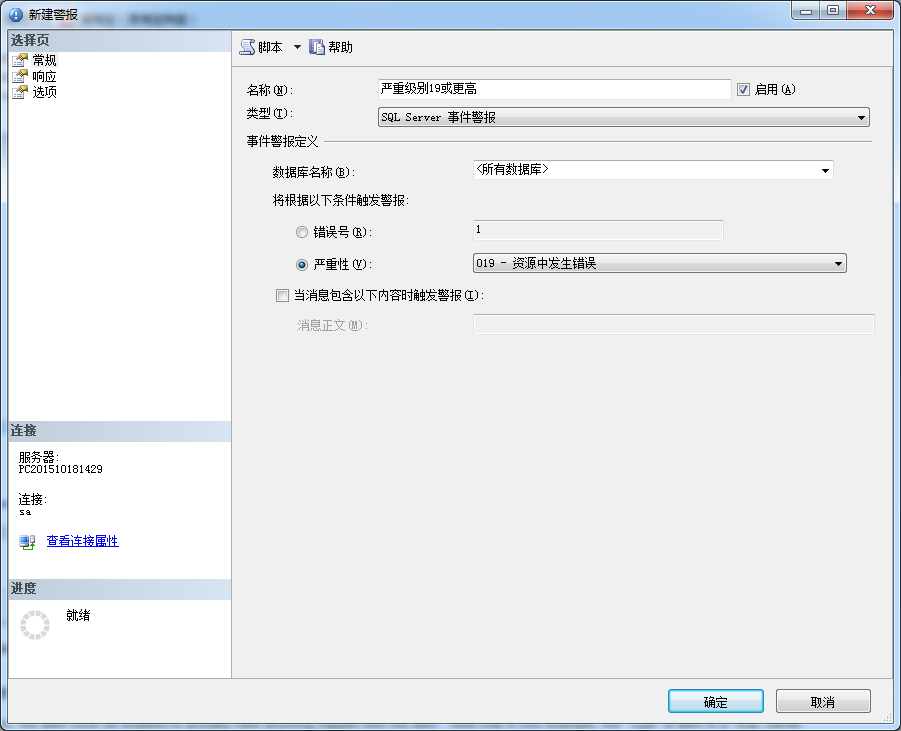 在新建警報對話框里的下拉框里的嚴重級別只是對于SQL Server所有可能錯誤的可用嚴重級別(查看RAISERROR命令文檔來了解更多:https://msdn.microsoft.com/zh-cn/library/ms178592.aspx )這些在19或更高級別的錯誤,需要DBA干預調查為什么會發生這個級別的錯誤。