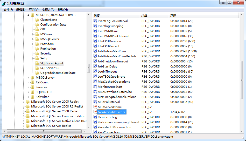 有意思的是你可以指定特定的錯誤信息從不觸發。為了定義這樣的錯誤,你必須人為更新服務器上的注冊表。注冊表是你特定實例上的。在HKEY_LOCAL_MACHINE\SOFTWARE\Microsoft\Microsoft SQL Server\MsSQL10_50.MSSQLSERVER下,你會找到SQLServerAgent,如插圖8所示。