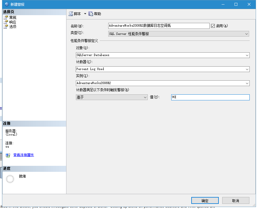 警報的第2個類型是 SQL Server性能條件警報。你可以給予性能計數器配置很多種類的警報。遺憾的是,你只能設置SQL Server的計數器,但這已經能讓你自動監控你的系統。例如,在插圖9里,當AdvantureWorks數據庫的事務日志超過90%滿時,你后收到警告的警報。一但你選擇如插圖4的選項,點擊【響應】頁來配置對這個警報對應采取的行動(如插圖5所示)。你會看到你可以執行SQL Server代理作業(例如剛才提到的日志空間增長,或開始備份數據庫),或提醒對應的操作員(例如我們剛才定義的操作員)。在這個例子里,當警報觸發的時候,我們選擇給“服務器警報”操作發送郵件。