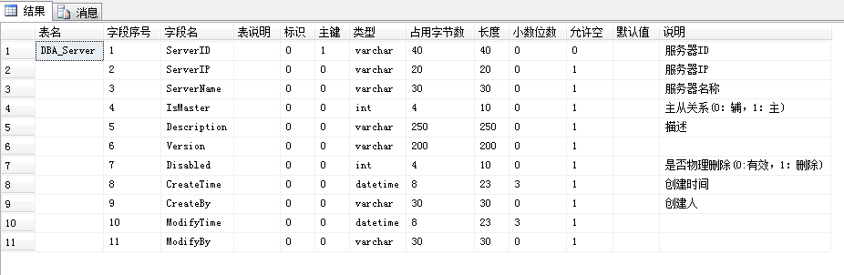 SELECT(casewhena.colorder=1thend.nameelse''end) 表名,a.colorder 字段序號,a.name字段名,(casewhena.colorder=1thenisnull(f.value,'')else''end) 表說明,(casewhenCOLUMNPROPERTY( a.id,a.name,'IsIdentity')=1then'1'else'0'end)標識,(casewhen(SELECTcount(*)FROMsysobjectsWHERE(namein(SELECTnameFROMsysindexesWHERE(id = a.id)AND(indidin(SELECTindidFROMsysindexkeysWHERE(id = a.id)AND(colidin(SELECTcolidFROMsyscolumnsWHERE(id = a.id)AND(name= a.name)))))))AND(xtype ='PK'))>0then'1'else'0'end) 主鍵,b.name類型,a.length 占用字節數,COLUMNPROPERTY(a.id,a.name,'PRECISION')as長度,isnull(COLUMNPROPERTY(a.id,a.name,'Scale'),0)as小數位數,(casewhena.isnullable=1then'1'else'0'end) 允許空,isnull(e.text,'') 默認值,isnull(g.[value],' ')AS[說明]FROMsyscolumns aleftjoinsystypes bona.xtype=b.xusertypeinnerjoinsysobjects dona.id=d.idandd.xtype='U'andd.name<>'dtproperties'leftjoinsyscomments eona.cdefault=e.idleftjoinsys.extended_properties gona.id=g.major_idANDa.colid=g.minor_idleftjoinsys.extended_properties fond.id=f.major_idandf.minor_id=0--where b.name is not nullWHEREd.name='DBA_Server'--如果只查詢指定表,加上此條件,此案例為表DBA_Serverorderbya.id,a.colorder