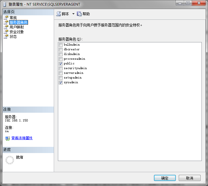 在SSMS的安全性——用戶名中可以找到該用戶,點開用戶屬性,發現只有sysadmin和public角色,沒有diskadmin角色