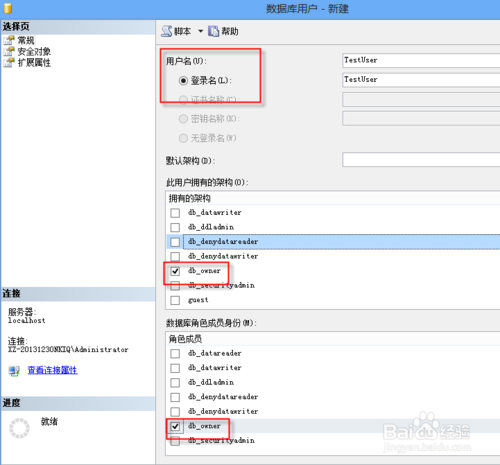 將剛才用戶名輸入即可,然后勾選用戶架構和角色;這里就勾選db-owner(擁有完全權限)