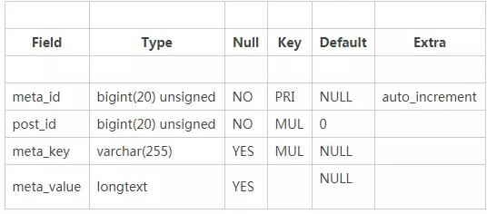 MySQL有一個很方便的語句DESCRIBE,它可以輸出表結(jié)構(gòu)的信息,比如字段名,數(shù)據(jù)類型等等。所以,當(dāng)你執(zhí)行DESCRIBE wp_postmeta;你將會看到如下的結(jié)果: