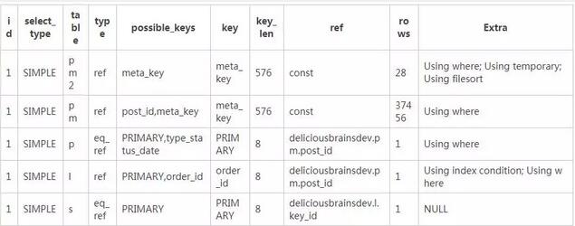 Explain也給了我們很多可以優(yōu)化的信息。例如,pm2表((wp_postmeta),告訴我們是Using filesort,因?yàn)槲覀兪褂昧?ORDER BY語句對結(jié)果進(jìn)行了排序。如果我們要對查詢結(jié)果進(jìn)行分組,這將會給執(zhí)行增加開銷。