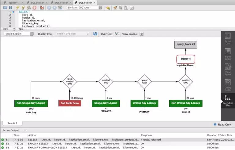 你應(yīng)該避免(https://dev.mysql.com/doc/refman/5.7/en/table-scan-avoidance.html)這種全部表瀏覽的查詢,因?yàn)樗褂梅撬饕侄蝟rder_id去連接wp_woocommerce_software_licences表和wp_posts表。這對于查詢慢是常見的問題,而且也是比較容易解決的問題。