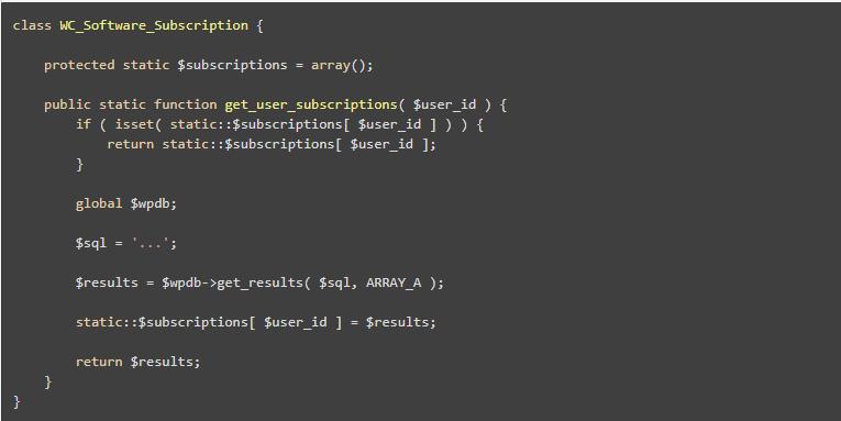 你的PHP 代碼中的靜態(tài)緩存很簡單并且可以很高效的解決這個問題。基本上,首次請求時從數(shù)據(jù)庫中獲取查詢結(jié)果,并將其存儲在類的靜態(tài)屬性中,然后后續(xù)的查詢語句調(diào)用將從靜態(tài)屬性中返回結(jié)果:
