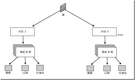下圖顯示了表的存儲組織,每張表有一個對應的對象ID,并且包含一個或多個分區,每個分區會有一個堆或者多個B樹,堆或者B樹的結構是預留的。每個堆或者是B樹都有三個分配單元用來存放數據,分別是數據、LOB、行溢出,使用最多的分配單元是數據。如果有LOB數據或者是長度超過8000字節的記錄,則可能有另外的LOB分配單元和行溢出分配單元。