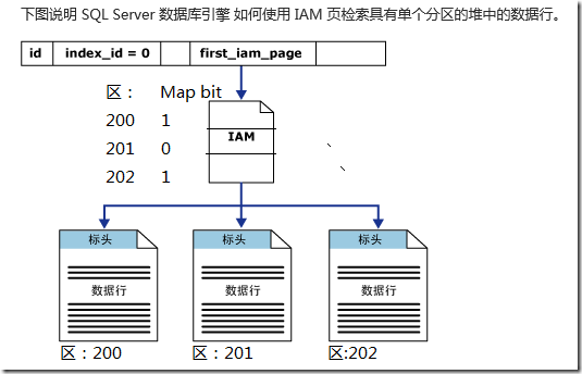 所謂堆(heap),就是不含聚集索引的表。堆的 sys.partitions 中具有一行,對于堆使用的每個分區,都有index_id= 0。只有一個分區,在系統表里,對于這個分區下面的每個分配單元都有一個連接指向Index Allocation Map頁(IAM),在IAM頁里,描述了區的信息。