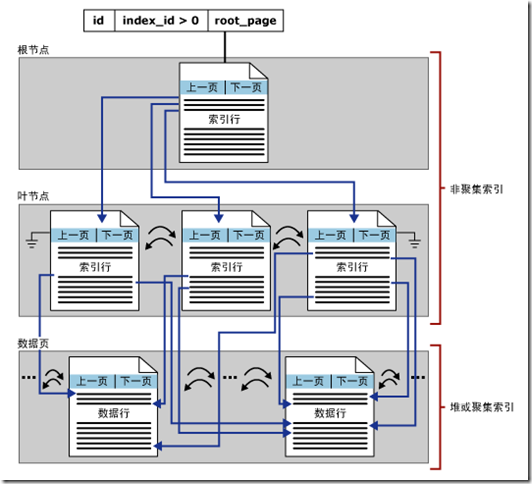 如果有一個表只有非聚集索引而沒有聚集索引,對應的索引號是2--250。那么針對每個非聚集索引,都有一個對應的分區,在系統表進而,對于這個分區下面的每個分配單元,都有一個連接指向根頁。數據頁之間通過前后指針互相聯系,是一個完整的樹形結構。在樹的底層,會有一個連接指向真正的數據,連接的形式是文件號+頁號+行號,而真正的數據是以堆的形式存放的。如下圖所示:
