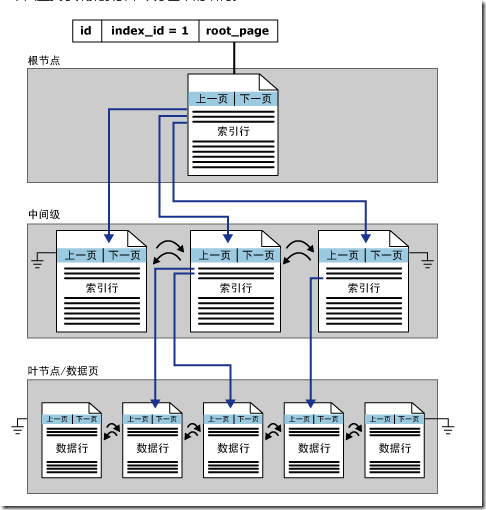 表中的聚集索引,對應的索引號是1。它有一個對應的分區,該分區下的每個分配單元都有一個連接指向根頁。對于聚集索引來說,葉子結點里存放的是真正的數據,而不是非聚集索引那樣的連接。如下圖所示: