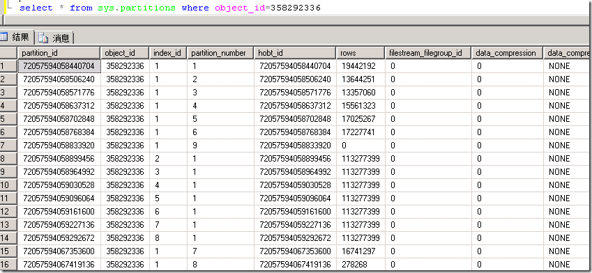 從上圖可以看到,此表共有16個分區,對應不同的索引,基本上每個分區都有1千多萬條記錄。從此圖中還可以看到堆或者B樹的ID跟分區ID是一樣的,如果希望進一步查看某一個索引的具體信息,可以使用下面的命令,如查看72057594067419136的信息。