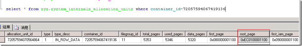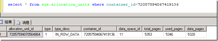 從這個圖當中,我們可以看到這個分區只有一個分配單元,IN_ROW_DATA表明此分配單元只用來存放具體數據,共5353頁,已使用5346頁,數據占用5320頁。