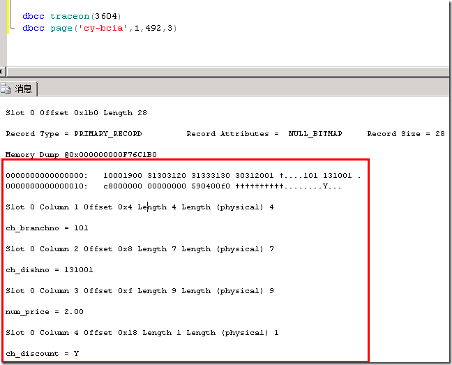 但需要注意,這里顯示的根頁的位置是0xEC0100001100,由于存儲的關系,用倒序的方式對它進行解析,也就是0x0011000001EC,最前面的兩個字節表明是所在的文件組編號,后面的4個字節是頁的編號,即(1,0x01CE) ,換成十進制(1,492),然后可以利用我們上一節所說的DBCC PAGE命令查看頁的信息,如下圖所示: