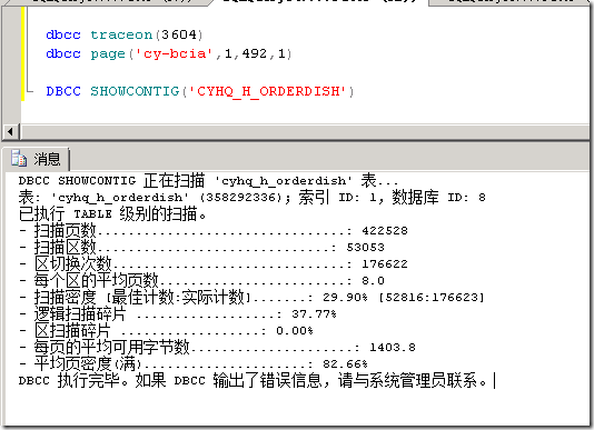 從中可以看到具體的數據,此界面的返回結果會因表上的聚集索引、非聚集索引而不同。如果查看一個表使用的總頁數和區數,也可以使用命令:DBCC SHOWCONFIG,如下圖所示: