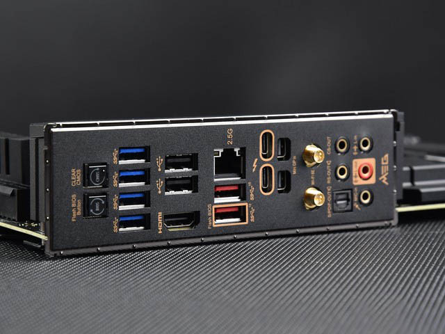 因為是高端主板,所以微星MEG Z590 ACE戰神主板不出意外預裝了I/O背板,同時在I/O區域這款主板提供了四個USB 3.2 Gen 1 5Gbps接口,兩個2個USB 2.0,兩個USB 3.2 Gen 2 10Gbps接口,還有兩個雷電4接口,可以提供高達40Gb/s的速率,以專用的兩個迷你DP接口,還板載Wi-Fi 6E無線網卡以及2.5G有線網口。最后就是常規的5個音頻接口,非常豐富而且全面。