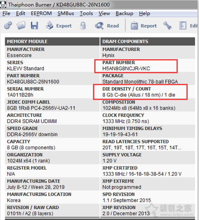 內存顆粒查詢軟件我們可以采用Thaiphoon Burner(臺風)軟件進行檢測,可以檢測到內存各個信息,最好更新到最高版本,軟件檢測不一定百分百準確哦。打開Thaiphoon Burner(臺風)這款軟件之后,我們點擊“Read”讀取內存查看PART MUMBER(顆粒編號),從顆粒信息中可以看出這根內存是CJR顆粒的。