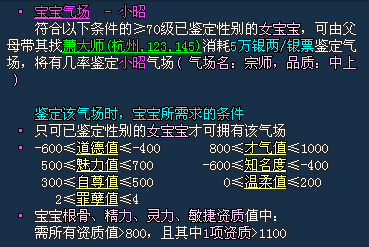 宗師氣場中有個小昭的女寶寶氣場,要求很低,適合平民選擇要求如下
