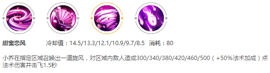 小喬向地上釋放一個范圍性的風,在此范圍內的敵人就會被小喬的甜蜜戀風給吹起來1.5秒的時間。期間敵人被吹起的過程中,敵人不能夠釋放技能。這個技能不僅能給自己和隊友爭取時間,在團戰的時候可是團戰的法寶。