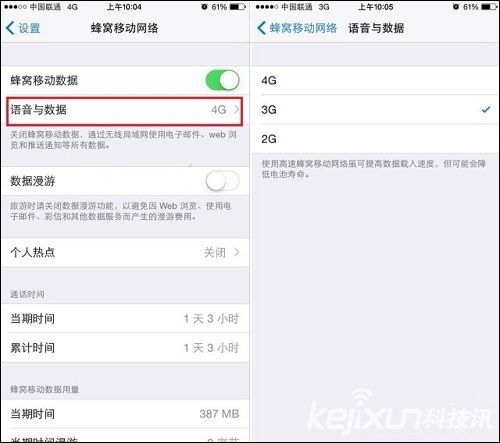 二、進(jìn)入蜂窩移動網(wǎng)絡(luò)設(shè)置后,再點(diǎn)擊進(jìn)入“語音與數(shù)據(jù)”設(shè)置,之后將默認(rèn)勾選的4G網(wǎng)絡(luò),勾選成“3G網(wǎng)絡(luò)”即可,勾選上,頂部的網(wǎng)絡(luò)標(biāo)識就是3G網(wǎng)絡(luò)狀態(tài)了,如下圖所示。