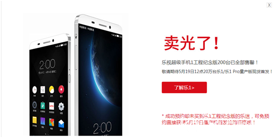 4月21日消息,今天上午10點,200臺樂視超級手機1工程紀念版在樂視商城開售,僅1秒售罄。參與本次預約卻未購買成功的樂迷,可免預約直接獲得5月19日量產機首發搶購資格。5月5日上午10點,20萬臺樂視超級手機1和樂視超級手機1 Pro量產機將開啟預約,5月19日中午12點開放購買。另據了解,今天中午12點,2.5萬臺樂視超級電視也將于樂視商城開放購買。