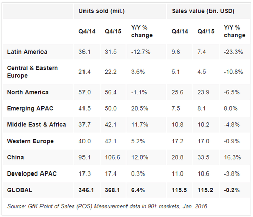 據(jù)市場(chǎng)研究公司GfK的最新《季度智能手機(jī)跟蹤》(Quarterly Smartphone Tracker)報(bào)告顯示,在2015年第四季度,全球智能手機(jī)的銷售額同比略微下跌了0.2%,下跌到了1152億美元。