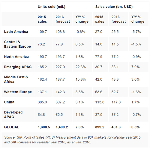 對(duì)于2016年,GfK公司預(yù)測(cè)智能手機(jī)發(fā)展的基本走勢(shì)將會(huì)繼續(xù)下去:廉價(jià)手機(jī)的銷量將會(huì)繼續(xù)增長(zhǎng)。全球智能手機(jī)的銷量將會(huì)從2015年的13.08億部增長(zhǎng)到2016年的14億部。但是,它的營(yíng)收將會(huì)基本持平,僅略微增長(zhǎng)0.5%,增長(zhǎng)到4013億美元。