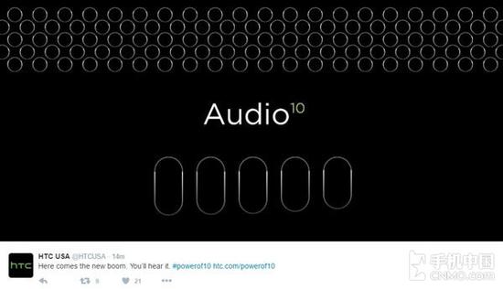 3月24日消息,昨日,htc正式確認旗下新品HTC 10即將于4月12日發(fā)布。今日,HTC馬不停蹄地為該機展開了新一輪預(yù)熱,HTC官方twitter發(fā)布最新海報稱,HTC 10將支持新的Boom音效。