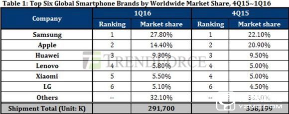 2016年4月底的時(shí)候,根據(jù)TrendFroce等機(jī)構(gòu)出具的全球第一季度智能手機(jī)出貨量報(bào)告。2016年Q1的總出貨量為2.9億部左右。其中,三星的市場(chǎng)份額為27.8%,蘋果為14.4%,華為為9.3%,是全球智能手機(jī)2016年Q1出貨量的前三名。此外,蘋果手機(jī)比同期大跌了5.5%的市場(chǎng)份額,創(chuàng)造了近十三年來的最差紀(jì)錄。
