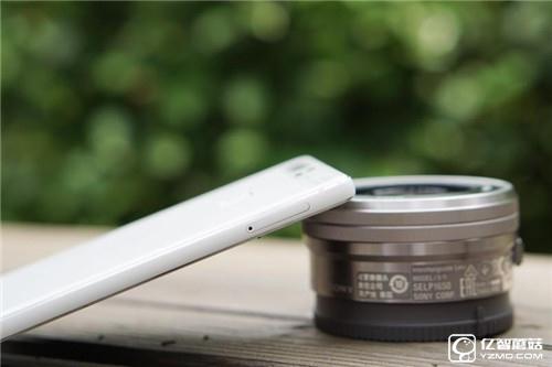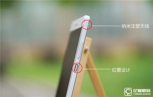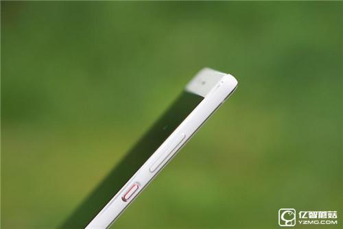 手機側面的按鍵,按下去反饋感覺良好,而且在關機鍵還有獨家的紅圈設計,手機上方和下方各有一條白色的納米注塑天線,還好機身也是白色所以看起來和機身融為一體。