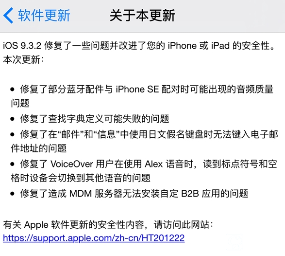 ios9.3.2正式版更新了什么功能,修復(fù)了部分藍(lán)牙配件與iPhoneSE配對(duì)時(shí)可能出現(xiàn)的音頻質(zhì)量問(wèn)題;...