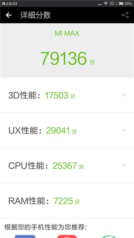 跑分結果雖不能完全代表性能,但7萬9的跑分成績來看,小米Max應付日常的上網、播放視頻和游戲(有一些游戲會出現不兼容的狀況)是完全夠用的。當然,拋開中規中矩的性能,最令人滿意的是小米Max的電池續航。