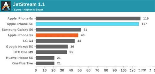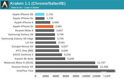 不出所料,iPhone SE在 Javascript測試中與iPhone 6s不相上下。雖然外形與iPhone 5s相似,但是iPhone SE的提升非常明顯,大約是前者的兩倍,這與蘋果在發(fā)布會上所說的2 倍性能提升一致。需要指出的是,這些是升級后的iOS 9 iPhone 5s的數(shù)據(jù),確保它也能受益于蘋果對Nitro Javascript引擎所做的升級和完善。