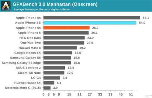 在Manhattan測試中iPhone SE的表現特別好,幀速率是iPhone 5s的三倍。雖然存在差異度,但至少蘋果所說的3x GPU性能提升并非夸張,而且在這么一個分辨率相對低的小屏幕上,你可以原生分辨率來渲染一個場景,速度可以達到60fps。
