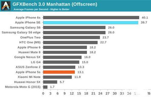 在這個測試中iPhone SE的表現也很不錯,奇怪的是iPhone 6s的分數低于iPhone SE,AnandTech無法確定這是因為驅動器不同導致的還是因為其他的什么原因。不過iPhone SE和 iPhone 6s的分數在測試中是最高的,是iPhone 5s的三倍。