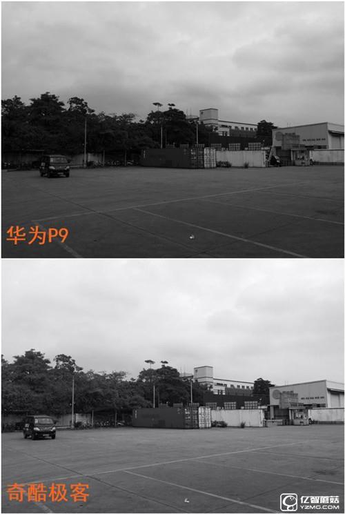 從數據看,因為黑白模式下感光元件只需要捕捉兩種顏色,所以快門速度也相對地縮短。P9的亮度仍然低于奇酷極客,后者在樹葉部分的模糊也明顯改善,可惜亮部的噪點較為明顯,整體上看還是P9更有味道。