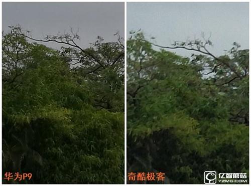 放大至100%之后,兩者之間的差距就出來了,華為P9的亮度雖然不濟,但細節保留更多,基本能看清楚樹葉的輪廓,而奇酷極客的涂抹感就非常強,在樹葉的部分已經糊成一片,最上面的樹枝的輪廓也不清晰。