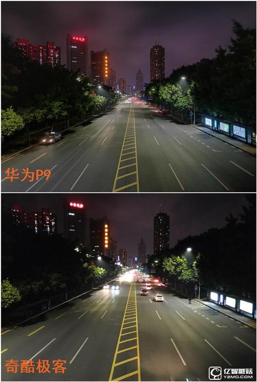 華為P9的超級夜景模式下會拉長曝光時間,同時將ISO壓在一個比較低的數值上,最后再進行算法合成,不僅提升暗部色彩與細節、同時保證高光處不會過曝。奇酷極客則是用1/15s的快門和接近1000的ISO去提升畫面亮度。華為的超級夜景需要三角架才能拍好,效果令人滿意。奇酷旗艦則是只需手不抖就能拍,實用性更強。