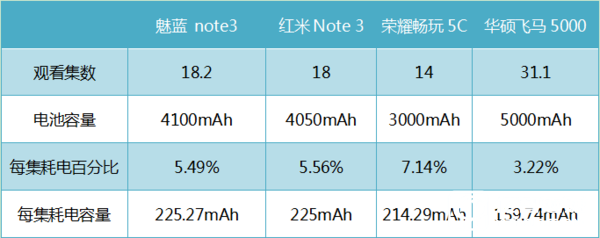 從表中可看到,華碩飛馬5000在電池容量和觀看集數(shù)兩項上一騎絕塵。在每集耗電百分比上,魅藍(lán) note3和紅米Note 3由于在電池容量和觀看集數(shù)上十分相似,因此十分接近,而榮耀暢玩5C和華碩飛馬5000的數(shù)據(jù)一對比則完美體現(xiàn)了電池容量大帶來的優(yōu)勢。